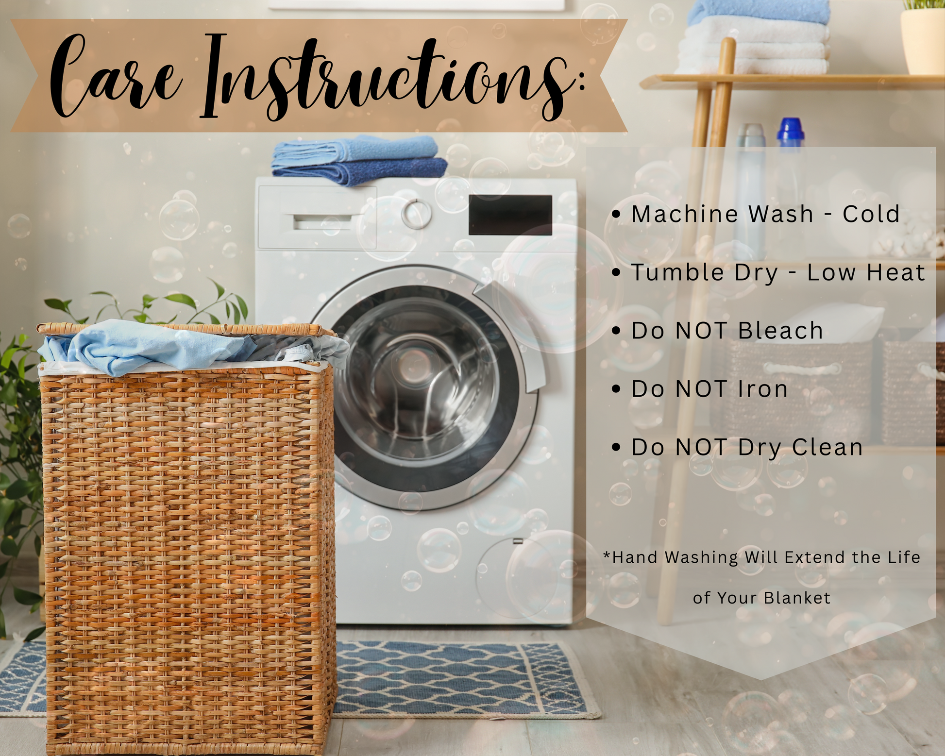 Do not dry clean. Do not iron. Tumble dry on low heat. Do not bleach. Machine wash cold max 30C or 90F. Hand washing will extend product quality.